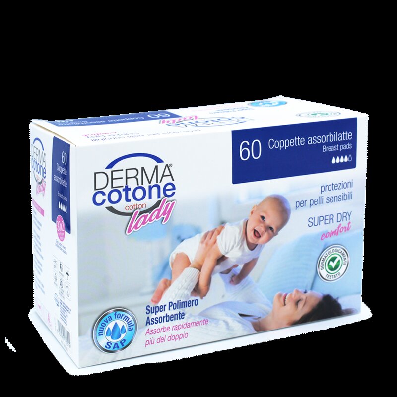 Le coppette assorbilatte Dermacotone sono realizzate con l’innovativo s.a.p. (super polimero assorbente) che consente di assorbire rapidamente il latte in eccesso riuscendo a contenere una quantita’ maggiore pari al doppio delle coppette comuni. Composte da materiale interno morbido e delicato.