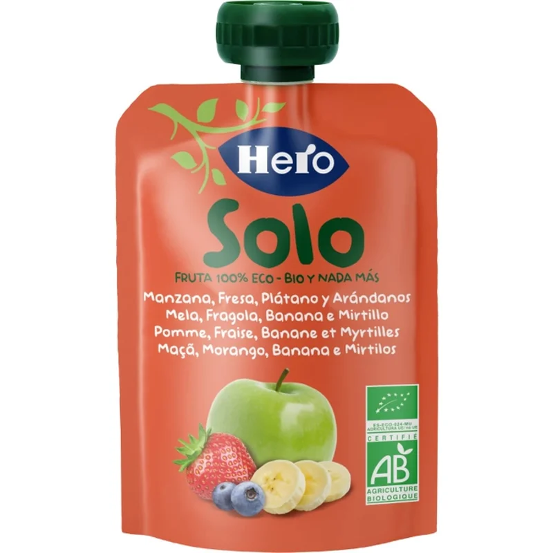 Frutta Frullata Mela, Fragola, Banana e Mirtilli Hero Solo è fatto con solo mela, fragola, banana e mirtilli biologici. Senza zuccheri aggiunti e senza glutine. A partire dai 4 mesi.