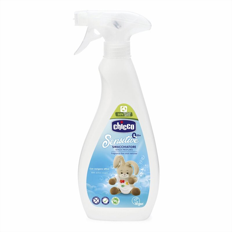 La smacchiatore spray per tessuti Chicco è realizzato con ingredienti naturali, privo di coloranti e con certificazione della società vegana.